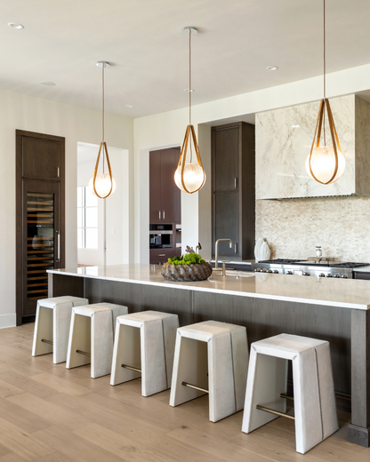 These counter stools beautifully combine texture and modern refinement. Crafted from white hair-on-hide, each backless design features a mitered whipstitch that forms a bold racing stripe down the sides. Slim antique brass bridges offer a striking contrast while providing structural support to the minimalist form. With their unique tactile surface and clean silhouette, these stools effortlessly complement a variety of interior styles while offering distinctive and stylish seating. Hide will vary, ensuring each piece is one-of-a-kind.